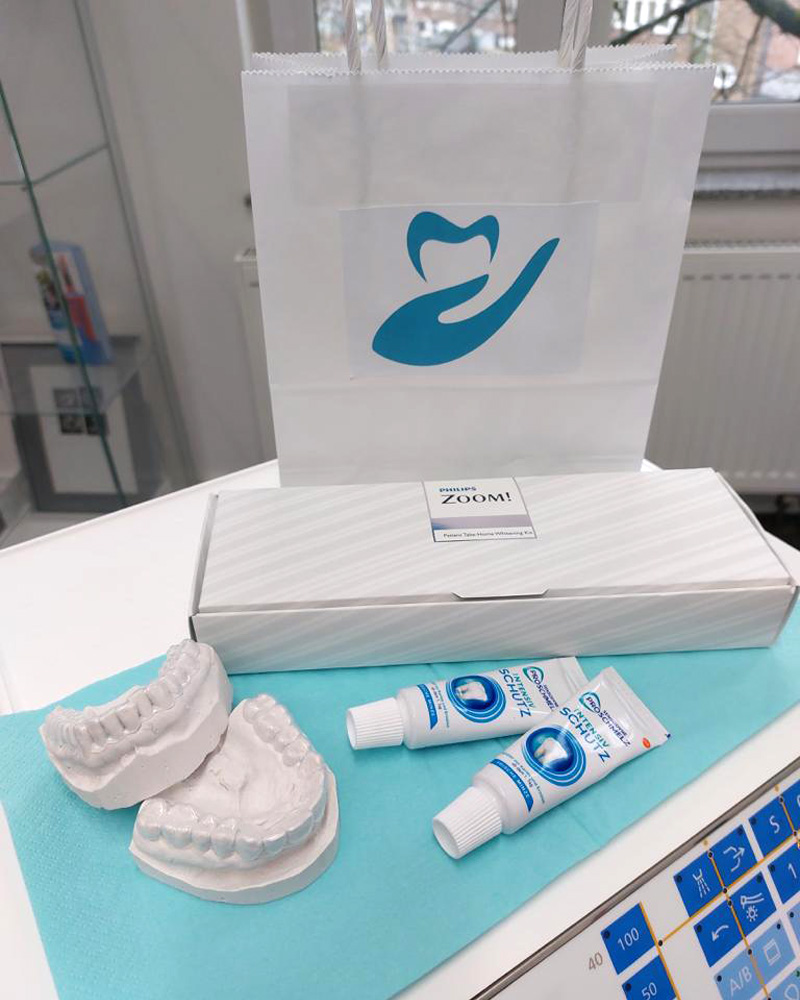 Die Zahnaufhellung in der Praxis wird komplett durch mein zahnmedizinisches Fachpersonal durchgeführt. Ein schönes Ergebnis kann in nur einer bis eineinhalb Stunden vollständig erreicht werden wobei die Wirkung des Gels durch eine speziell hierfür entwickelte Lampe mit blauem LED-Licht verstärkt wird.